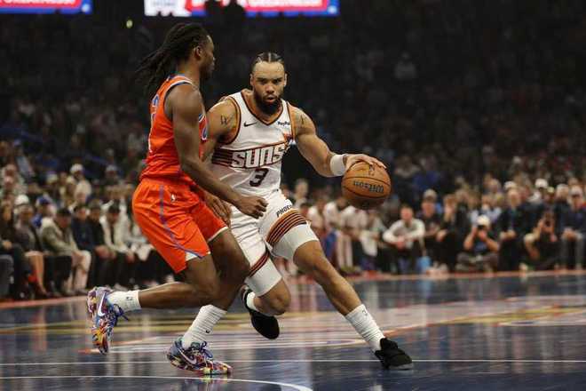 雷霆过去15场比赛豪取15连胜联盟第一,太阳上一场客场108-105险胜森林狼。本场雷霆缺少哈尔滕施泰与乔等,太阳缺少布克、杰伦-格林。首节开局,雷霆率先取得11-2领先优势,阿伦与霍姆格伦对攻一记三分,太阳随后反扑追到差7分。雷霆多点开花不断碾压太阳,逐步扩大36-16领先20分优势,太阳回敬一波7-2攻势追分,首节结束雷霆38-23领先太阳。首节雷霆23中14超过6成准星,其中三分8中5,太阳被限制24中9不足4成准星,其中三分7中3。